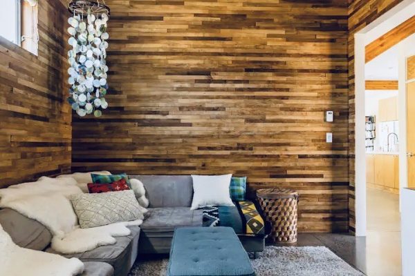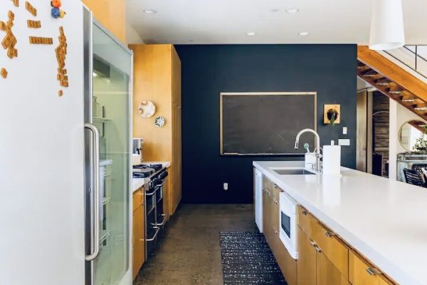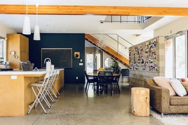 Inside, enjoy the fun and function of our light and bright 3,200 sq/ft modern home where mid-century meets industrial with polished, heated concrete floors, glass roll-up garage doors into living spaces, extensive library, arts & craft room, fireman’s slide pole, 16 foot Caesar stone kitchen island, professional appliances, media room, spa bathroom, game cupboard, foosball and a whole lot more to make your time away unforgettable. With beds for 11 and plenty of room to spread out sleeping bags on couches and carpet, it’s a great set up for a large family, 2-3 smaller families, or groups of up to 12.